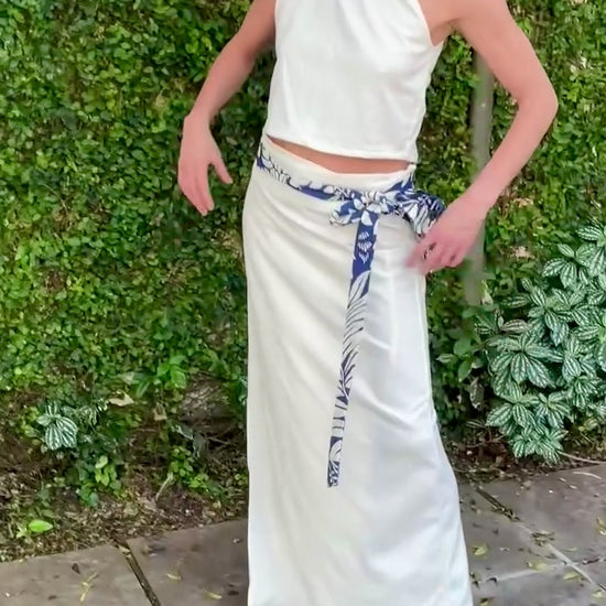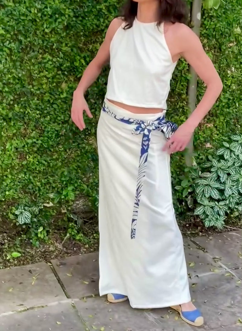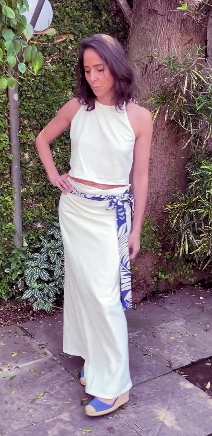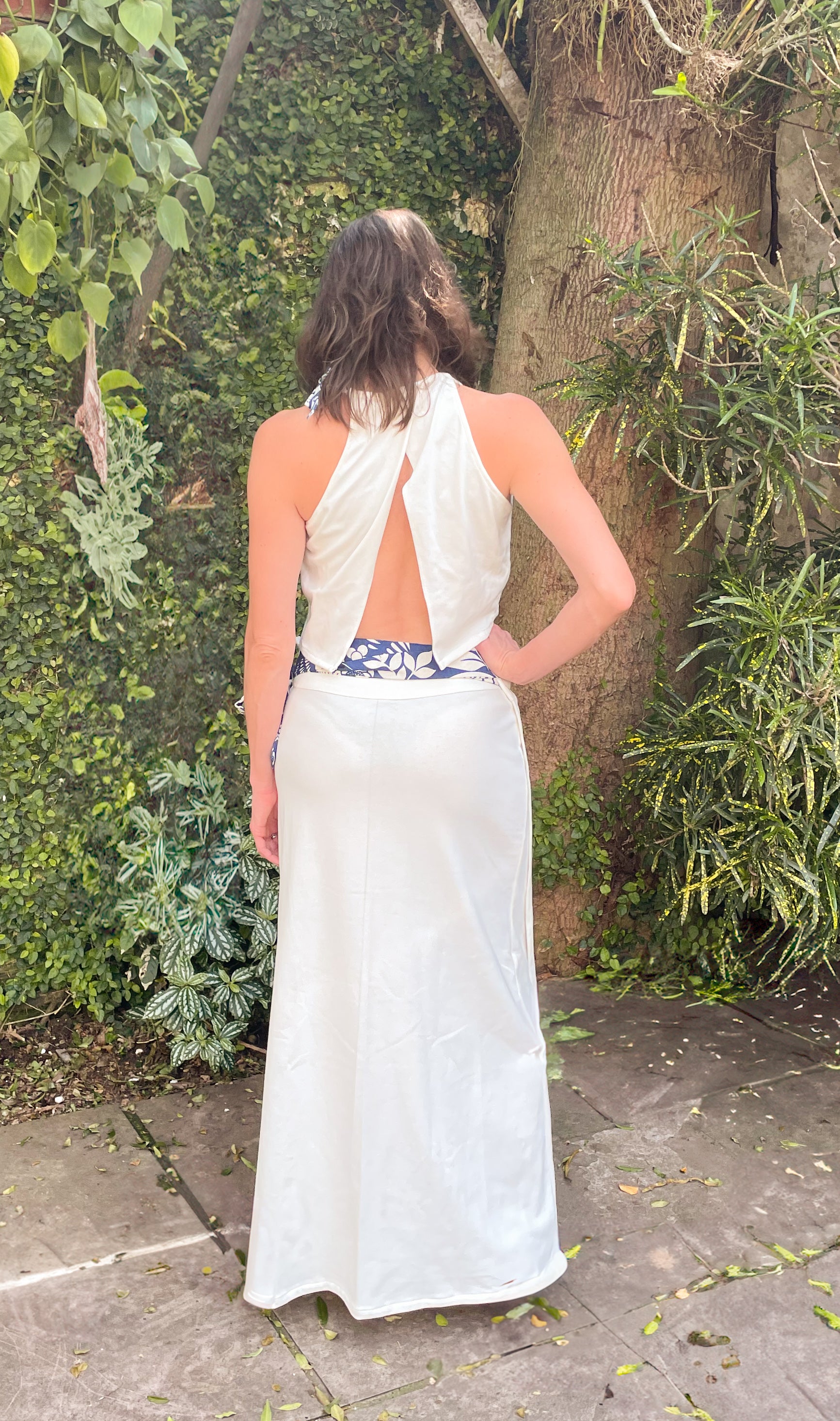 Características: Saia maxi envelope fecha com cinto atado. Top cavado, aberto nas costas, fecha com laço no pescoço.