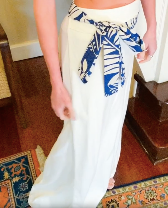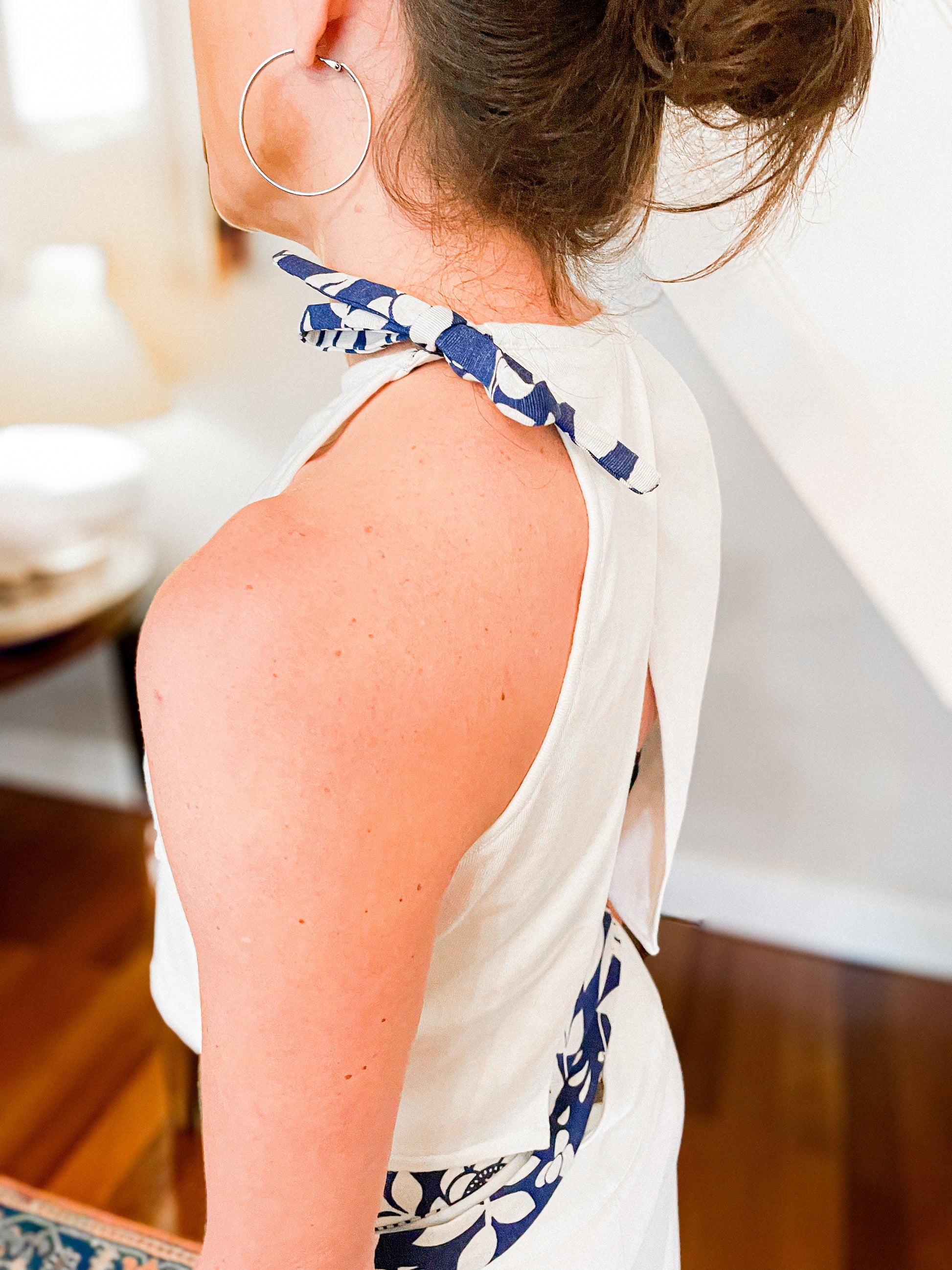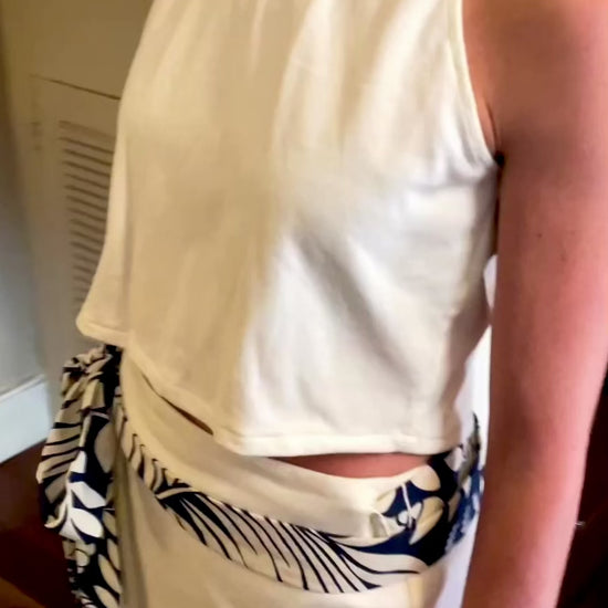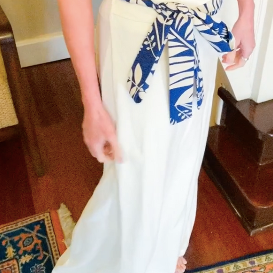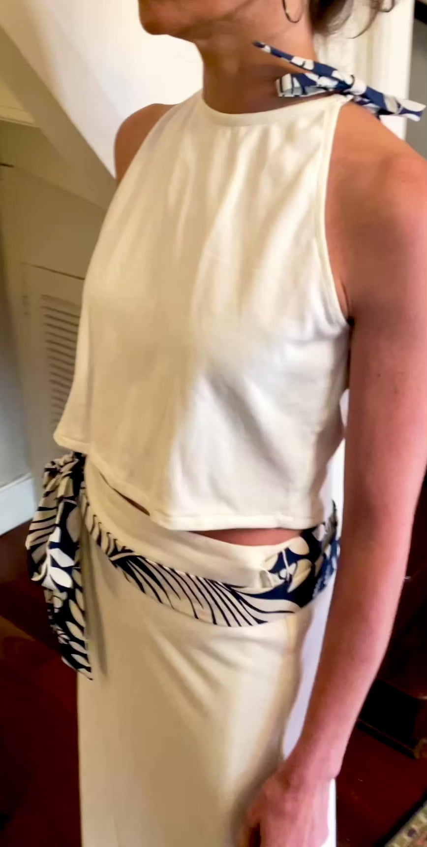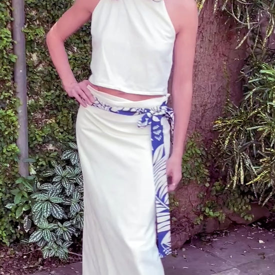 Características: Saia maxi envelope fecha com cinto atado. Top cavado, aberto nas costas, fecha com laço no pescoço.
