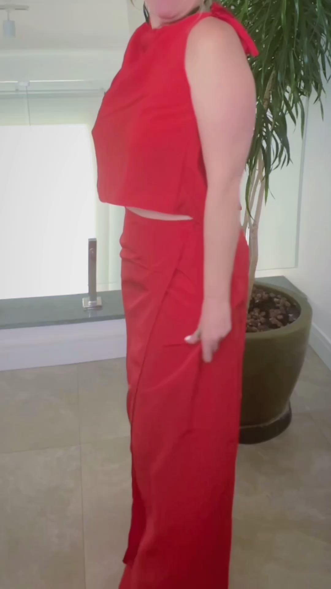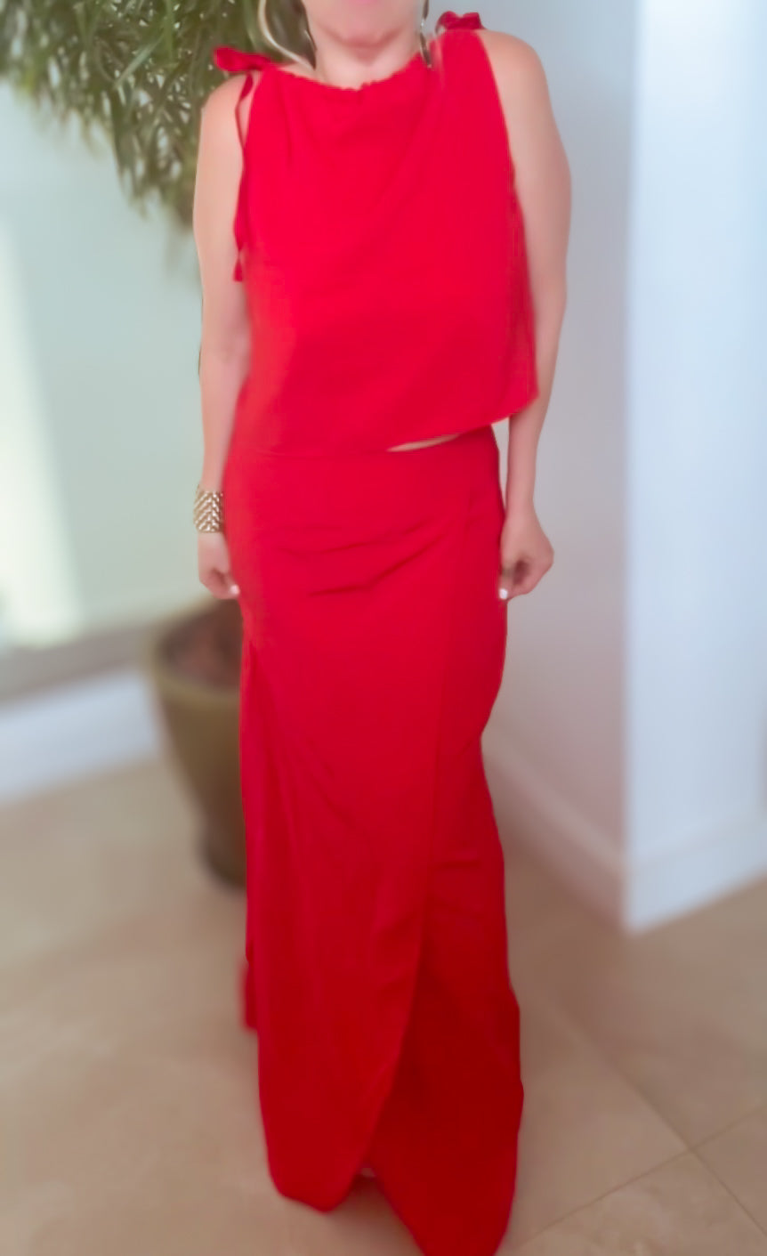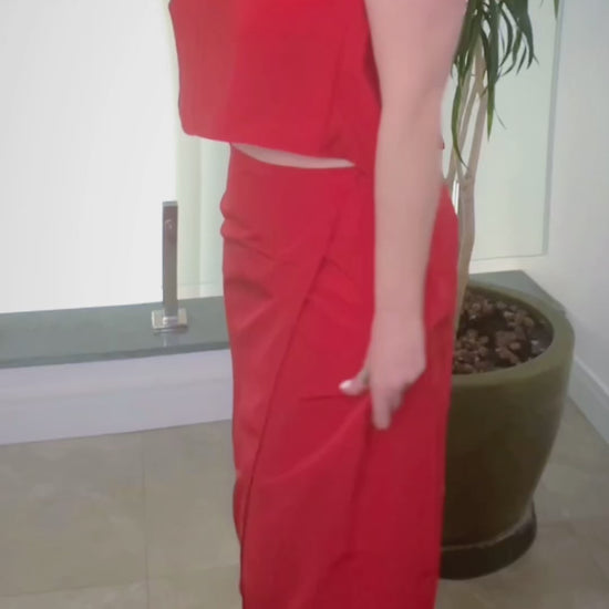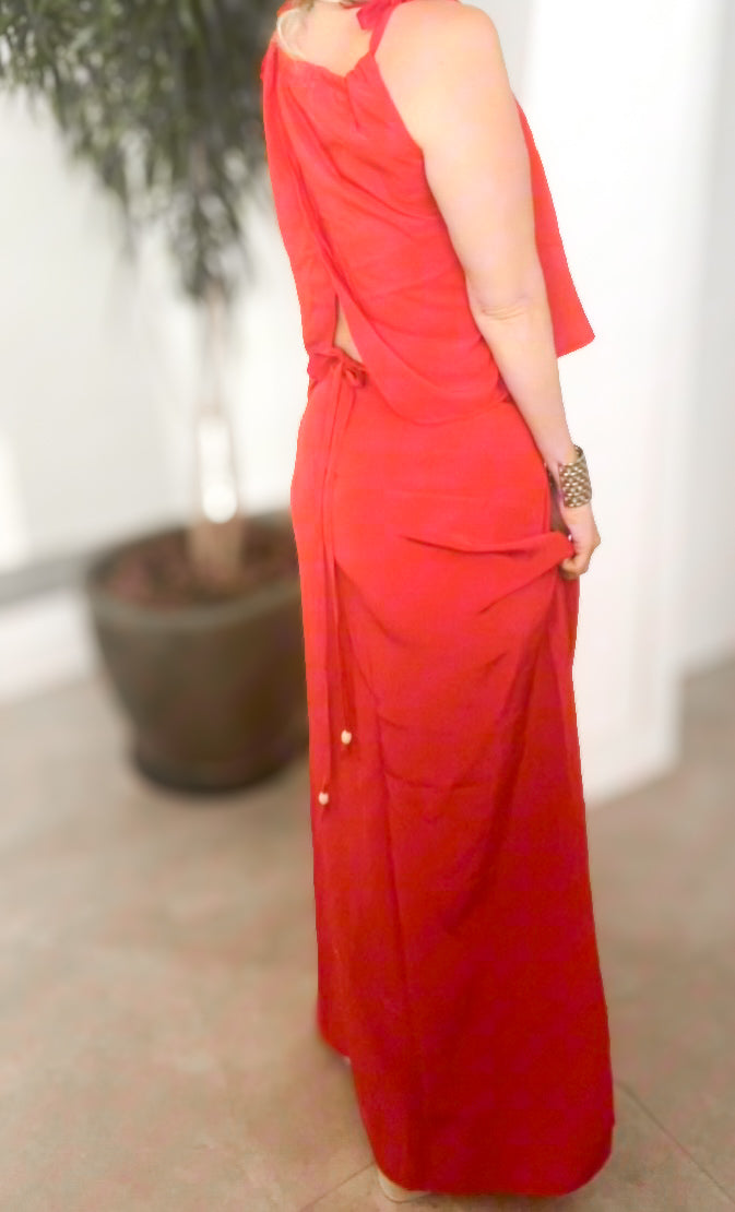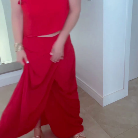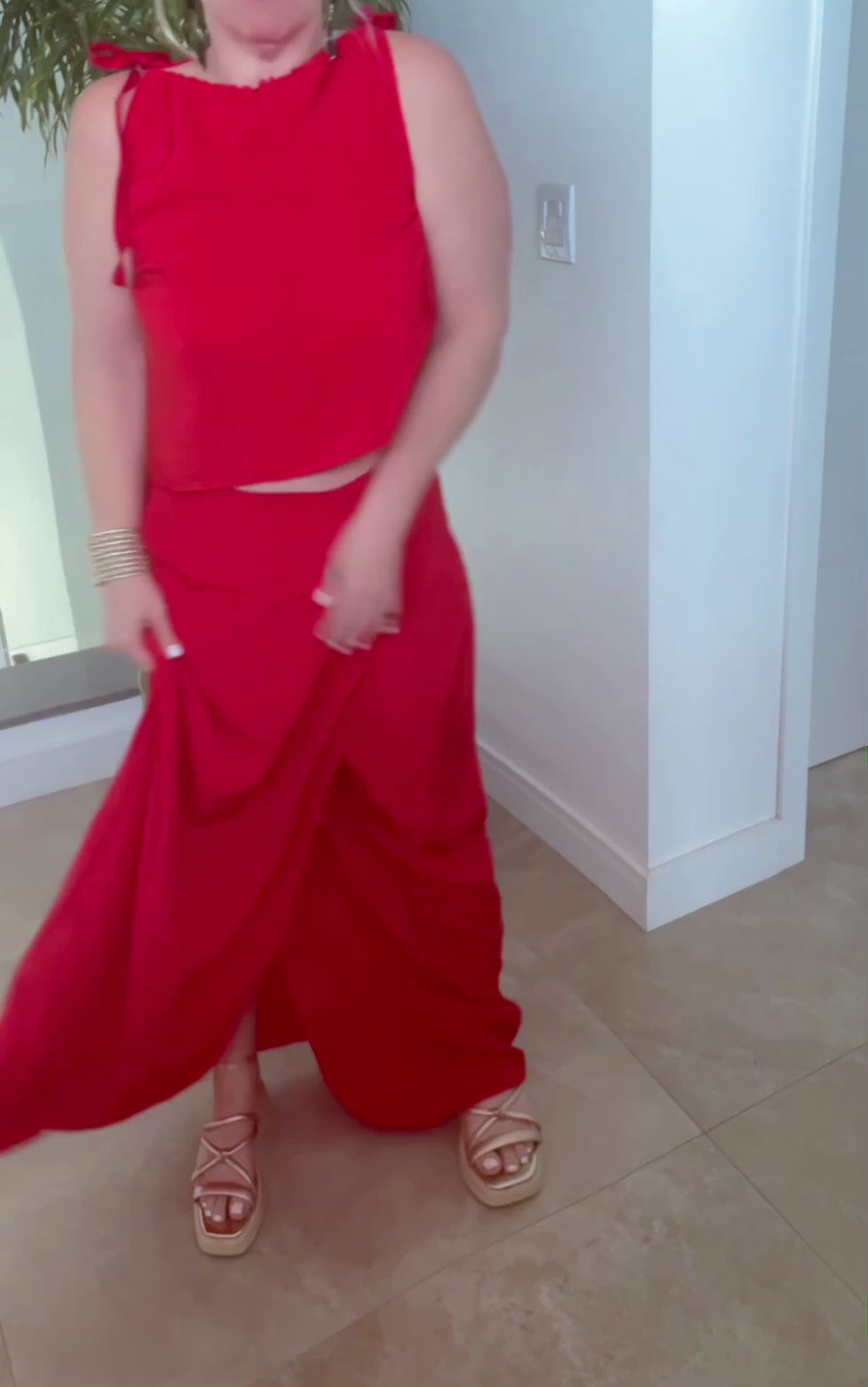 Características: Saia maxi envelope. Top cavado, aberto nas costas, fecha com laços nas alças. Detalhe em madeira no cinto da saia.