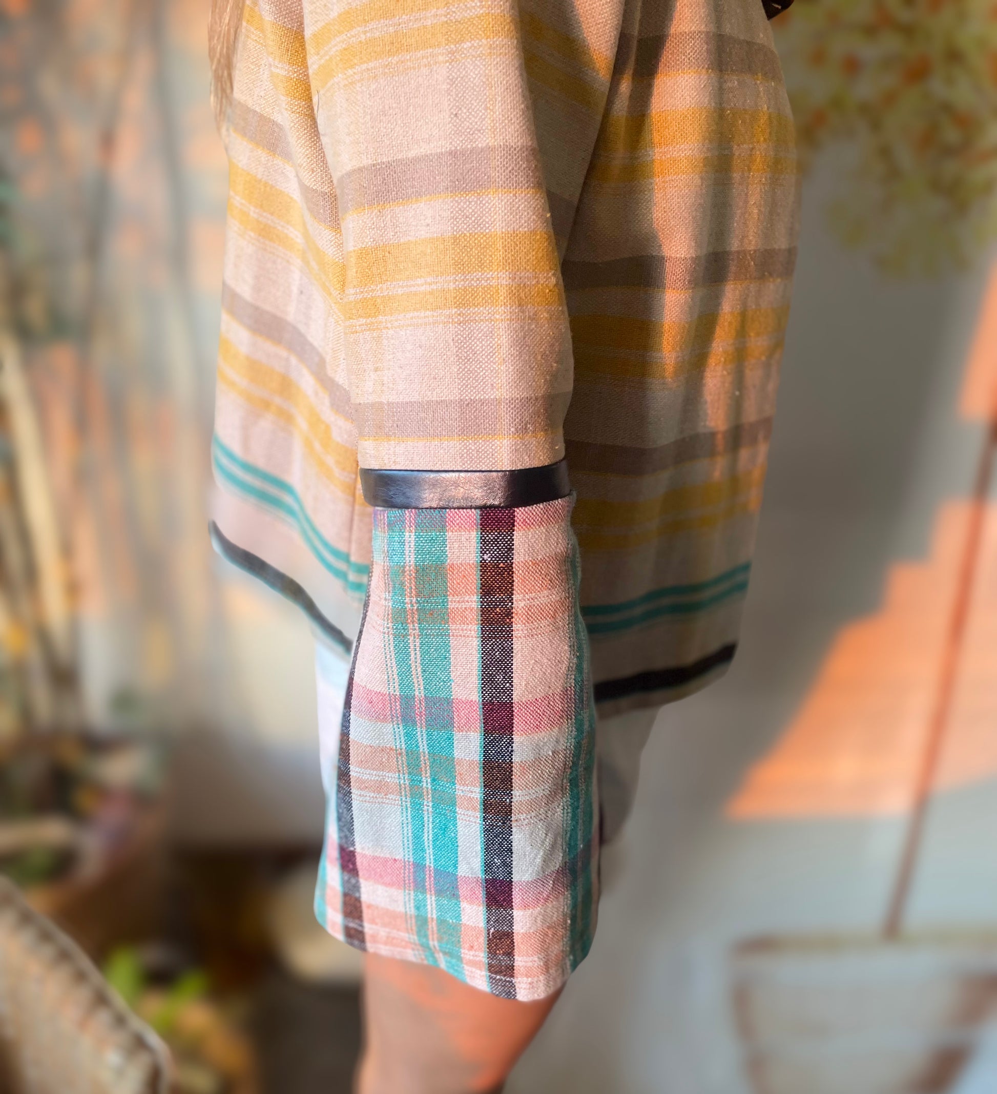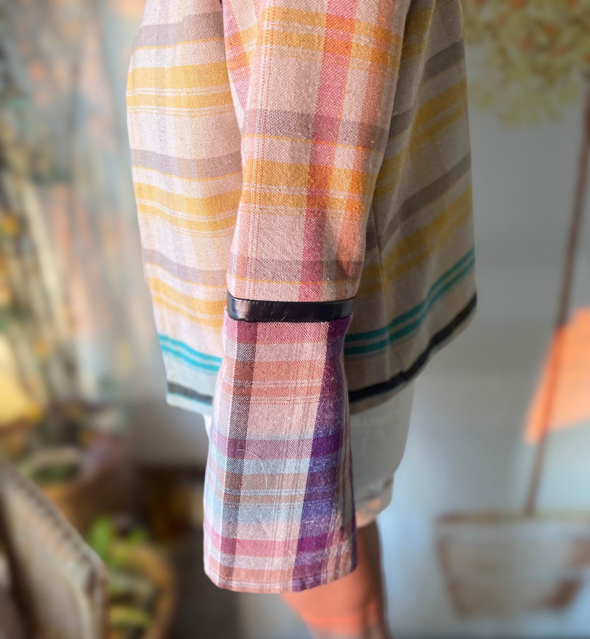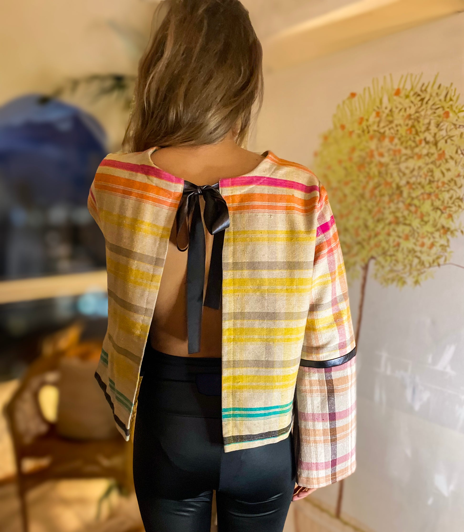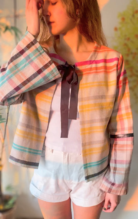 Jaqueta xadrez confeccionada em tecido rústico sustentável com forro de cetim e laço de couro sintético.