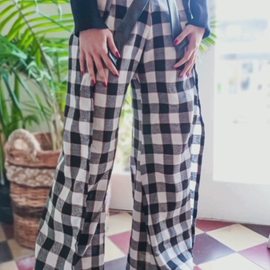 Calça de flanela xadrez preta e branca com detalhe em couro sintético.
