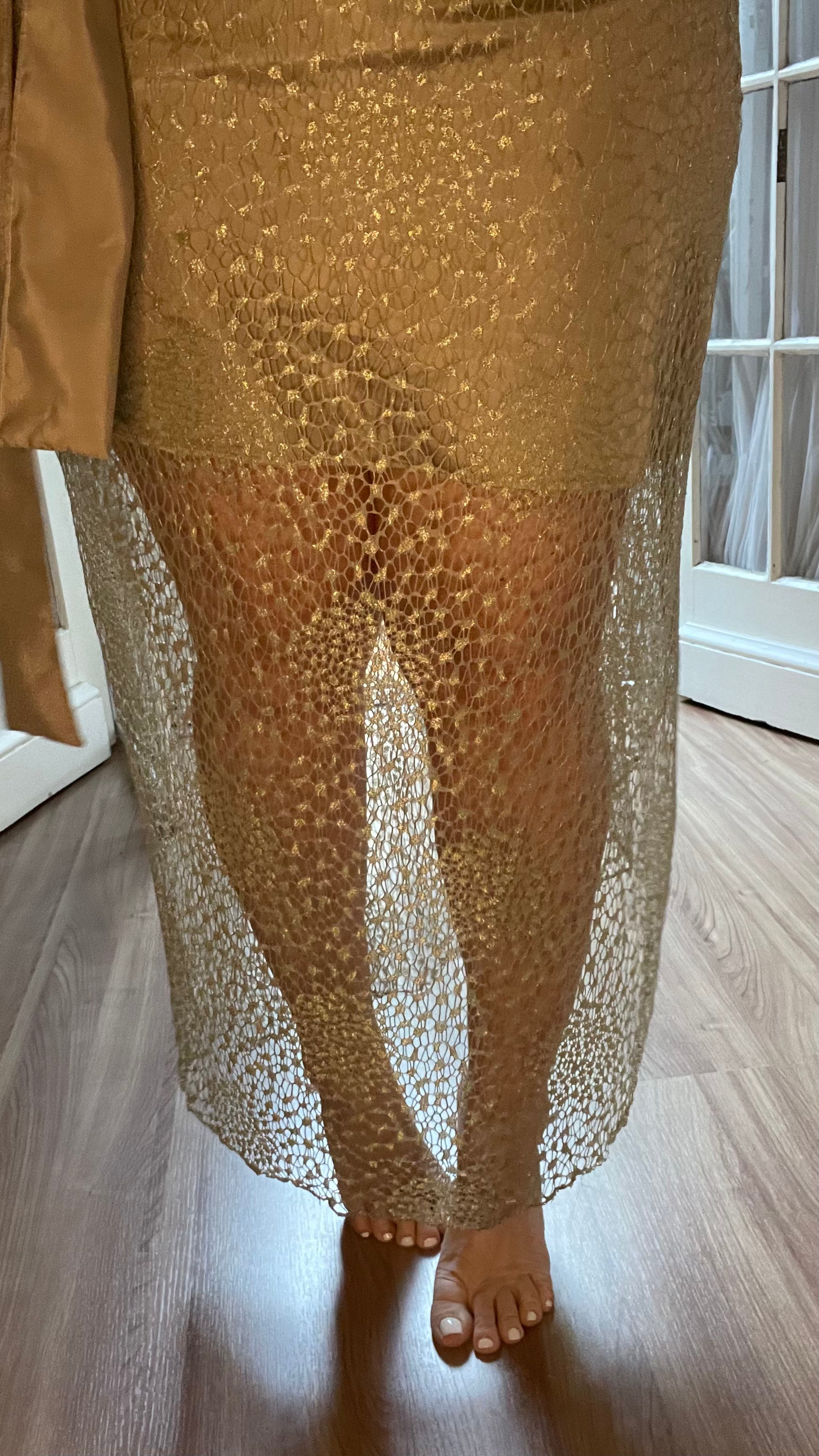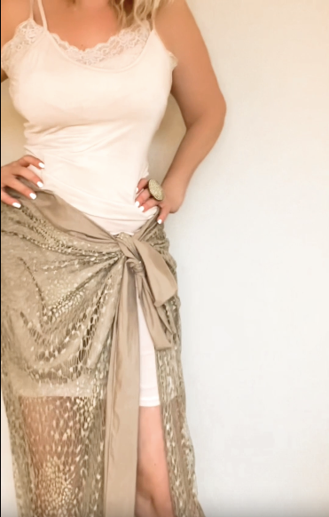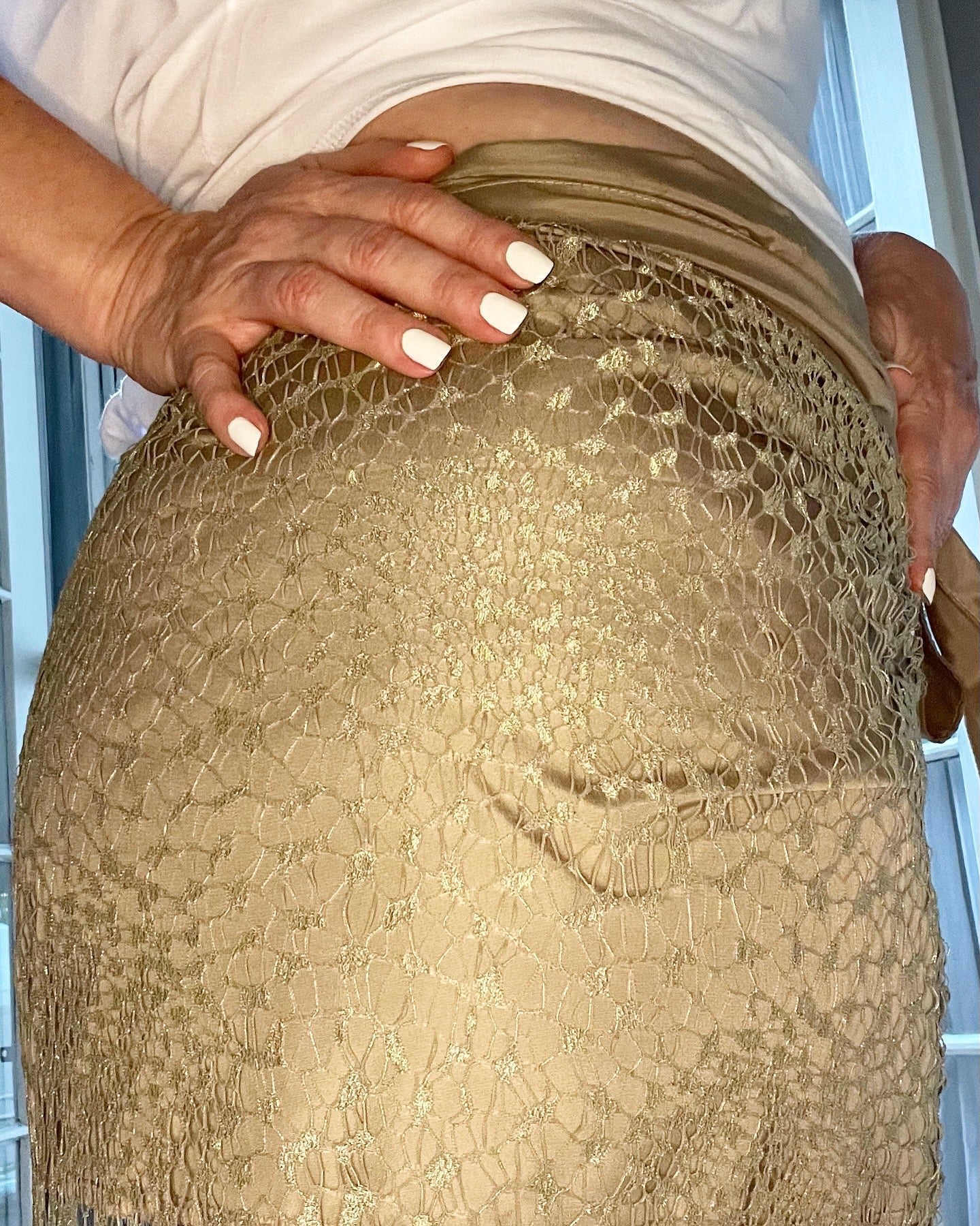 Características: Saia envelope de renda dourada com forro de microsuede.