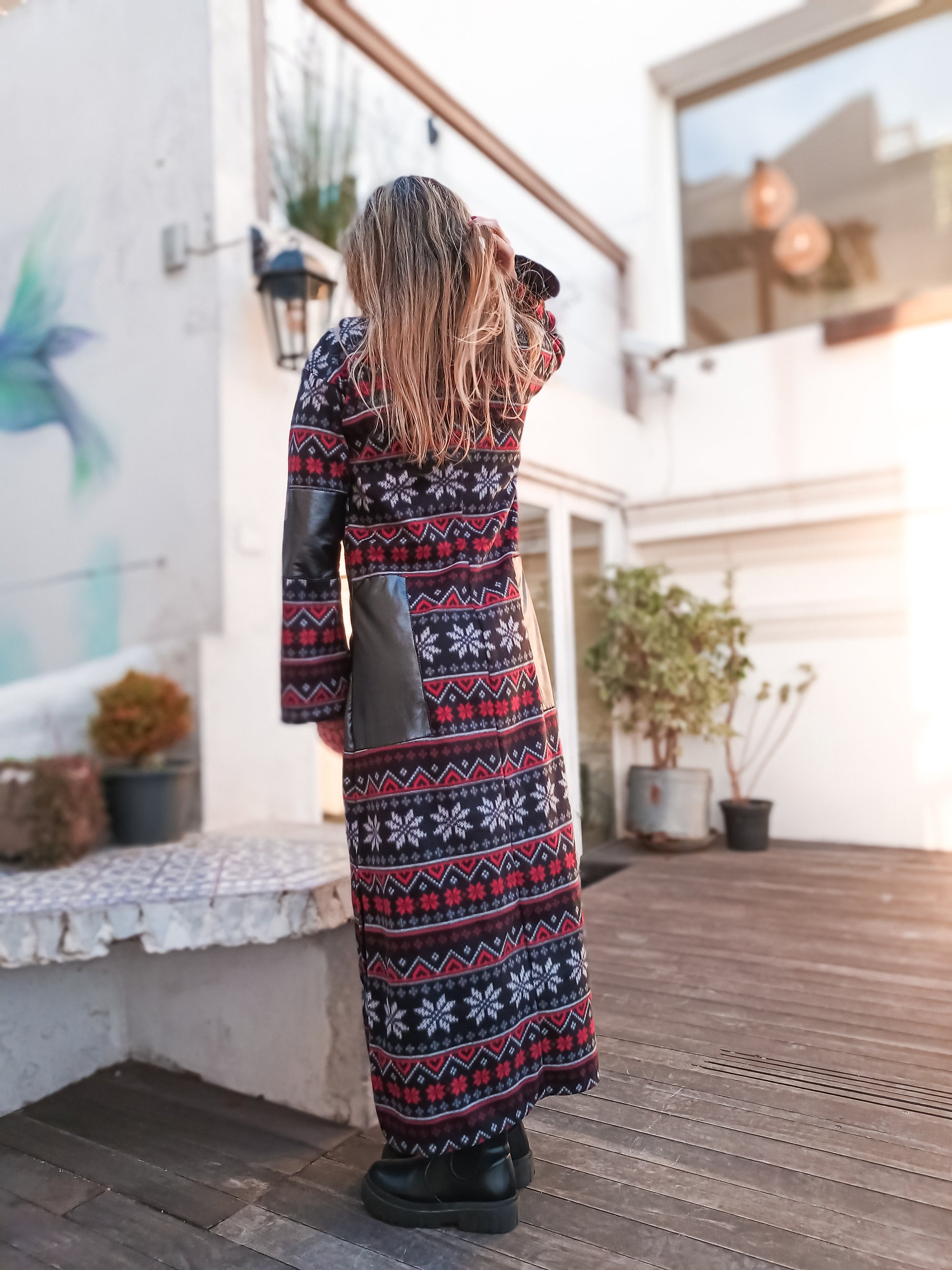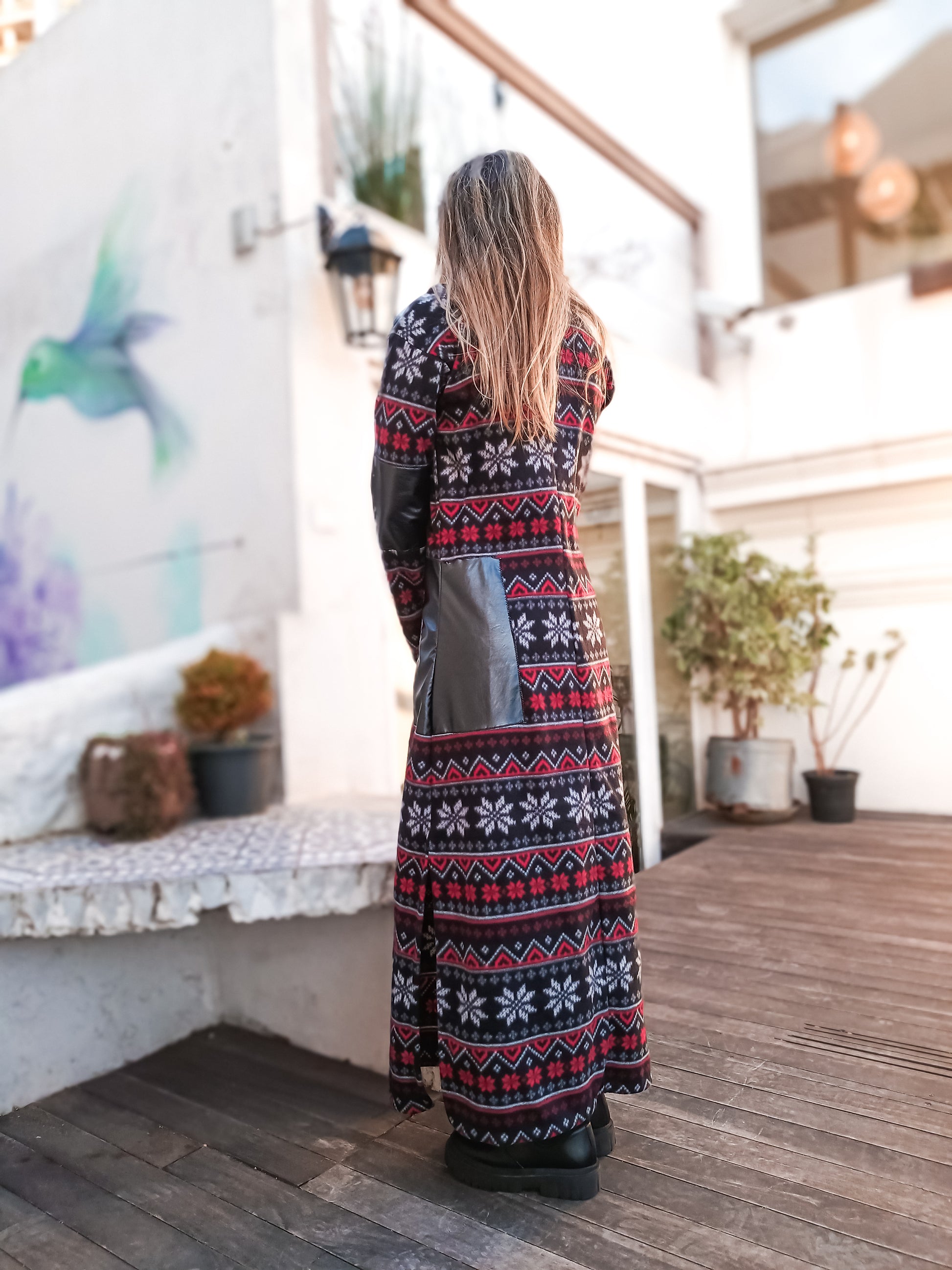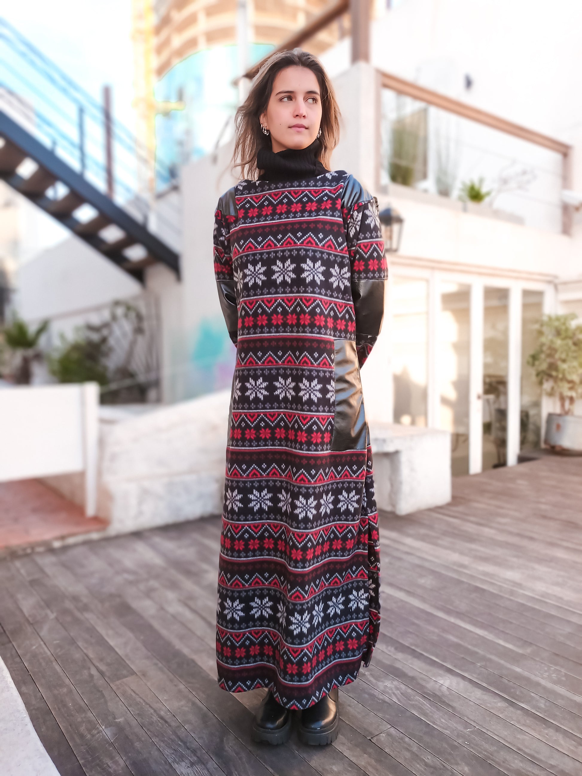 Vestido de tecido soft estampado com detalhes em couro sintético.