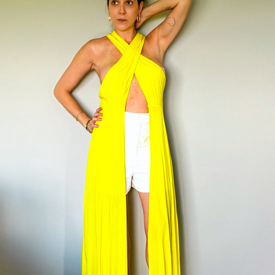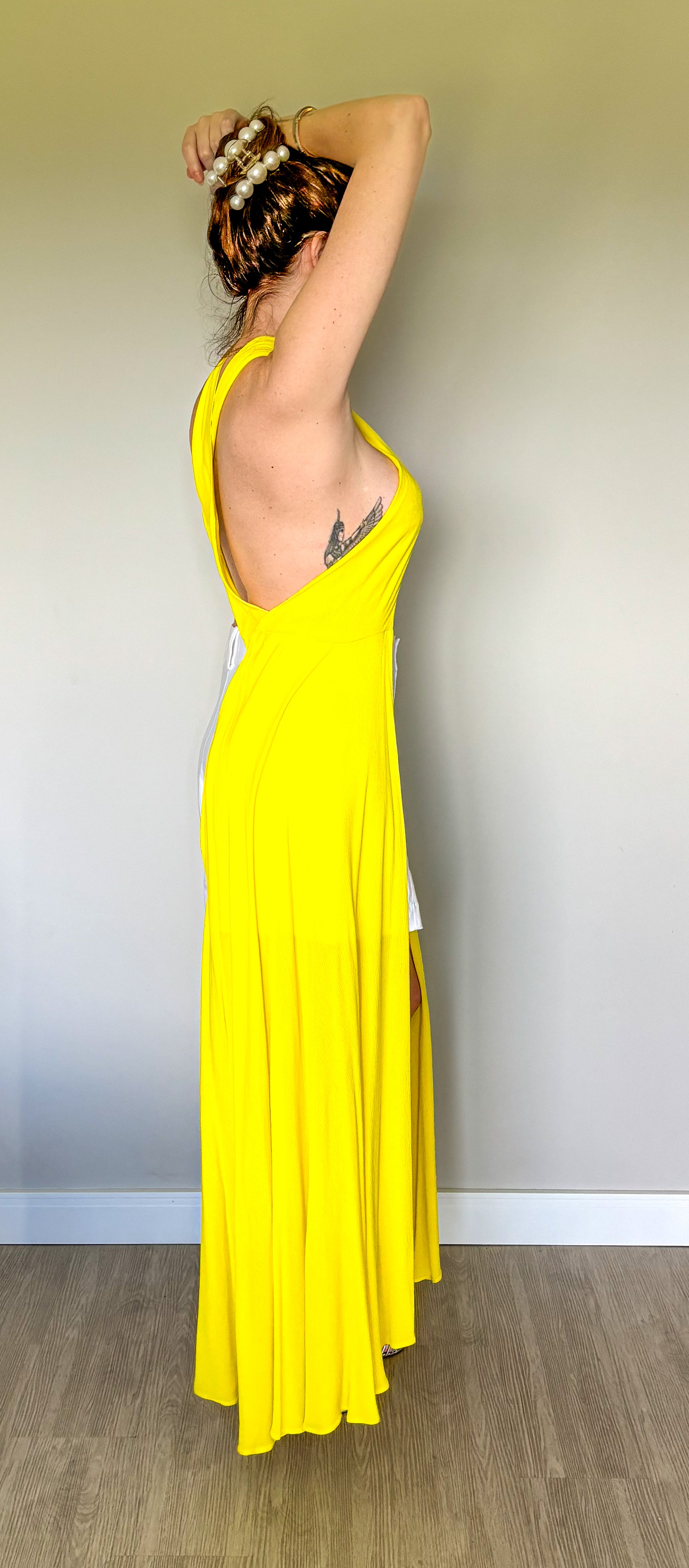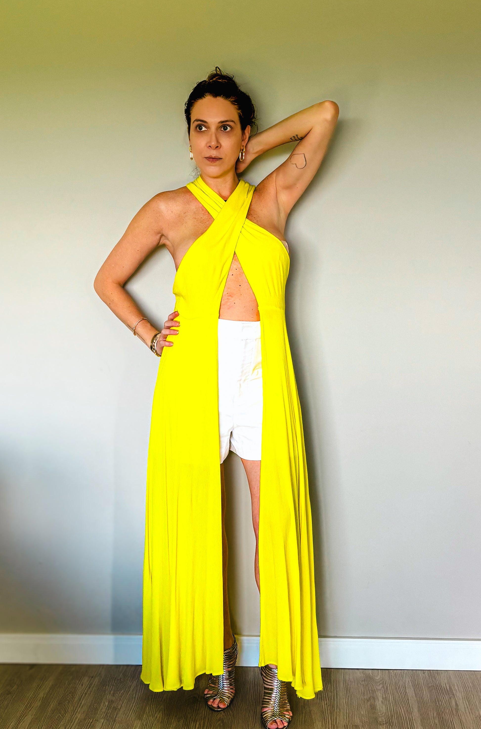 Características: Vestido cavado em 'X', rodado dos lados e aberto na frente e atrás